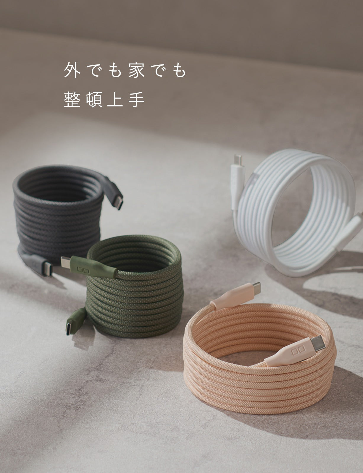 ケーブル全体が磁力でまとまるので、パチッときれいに収納が可能です。 PC周りやリビングでのケーブル環境がスッキリ。