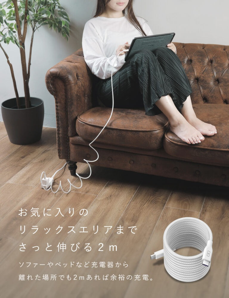 スマホや小型デバイスにすっきりつながり、 お出かけ時のバッグ内のごちゃつきや充電時のたわみをなくせるので、 持ち歩くのにも最適です。