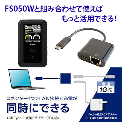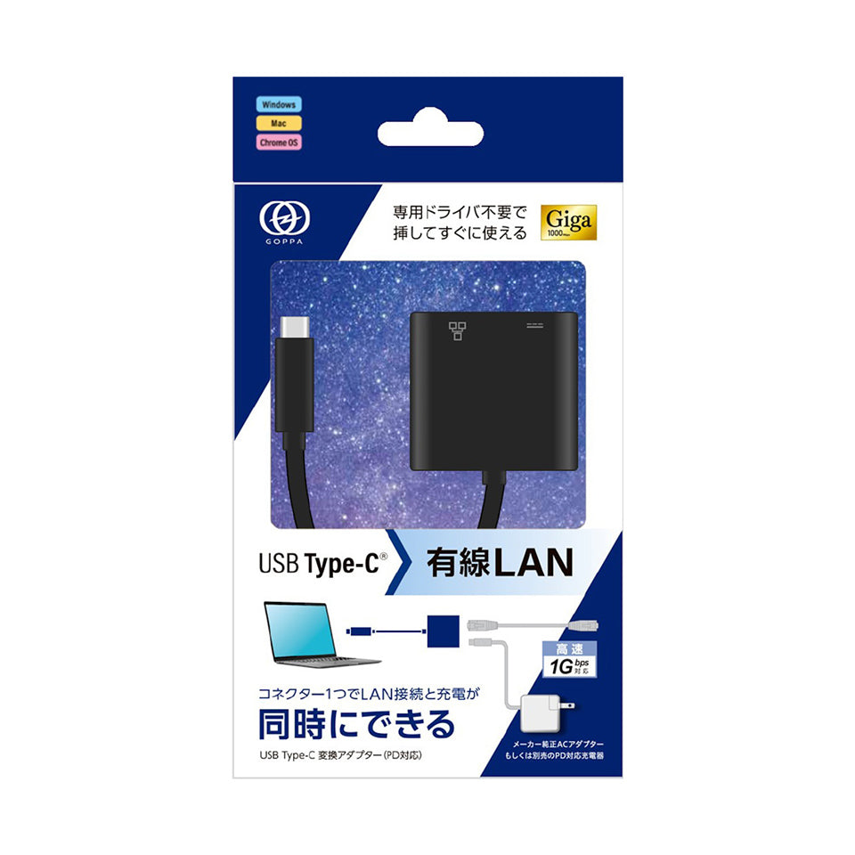 富士ソフトFS050W動作検証済み、PD「Power Delivery」対応、Type-C搭載のパソコン/ タブレットなどを高速充電しながら有線LAN(最大1Gbps)が使用できるLANアダプタGOPPA GP-CR45H。